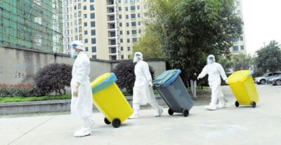 “各楼层的医疗废物(含生活垃圾)先由楼层卫生员用双层的黄色垃圾袋收集完,扎紧后封口,放到病房门口。我们队员拖着转运设备在各病房门口收集,收集之前必须对垃圾袋物表面进行消毒。”陈钊说,对每一道环节都有严格的操作流程。