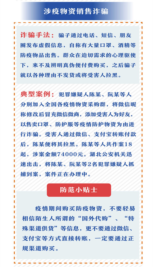 防范小贴士:疫情期间购买防疫物资,不要轻易相信陌生人所谓的“国外代购”、“特殊渠道供货”等信息,更不要通过微信、支付宝等方式直接转账,一定要通过正规渠道购买。