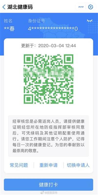 3月5日,宜昌市大数据健康码管理平台将唐先生的申请发到五峰县,五峰县防控指挥部开具证明后,向省健康码管理平台申请,一天时间完成整个流程并获赋“绿码”。