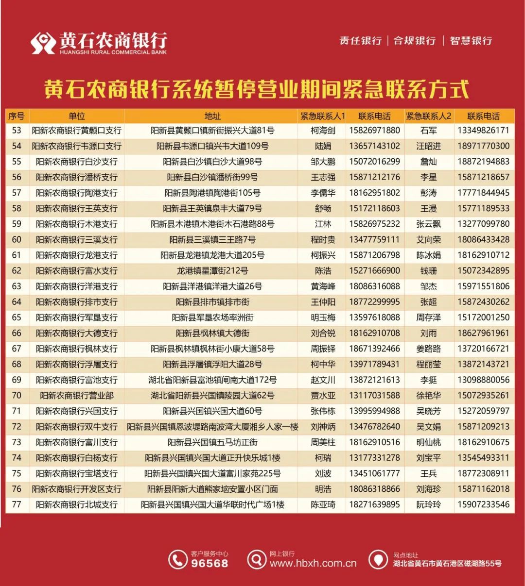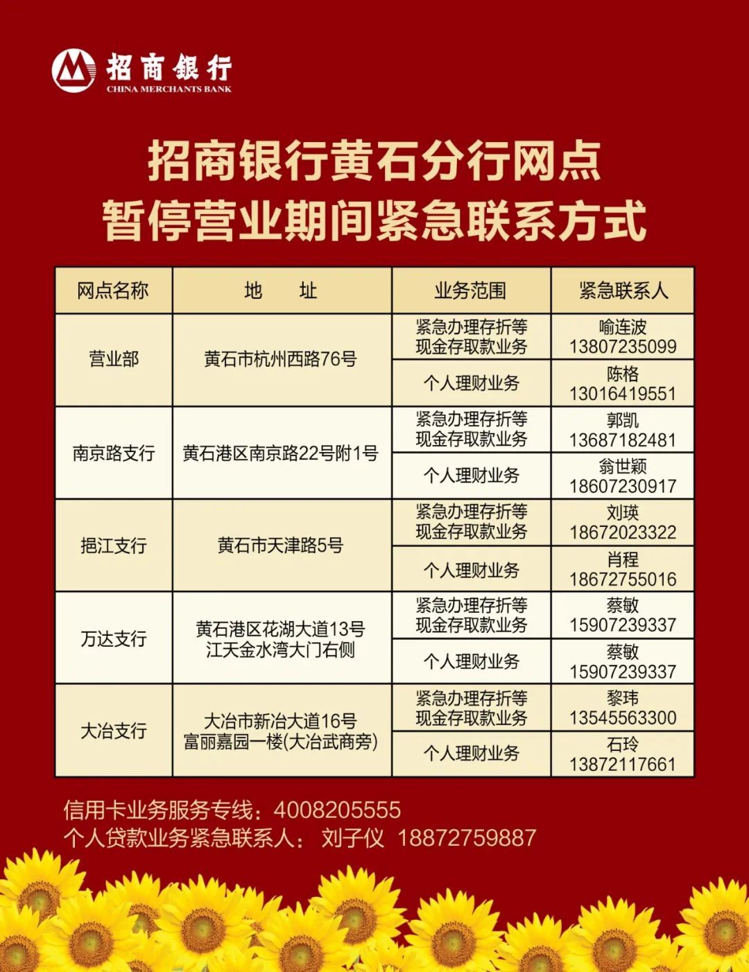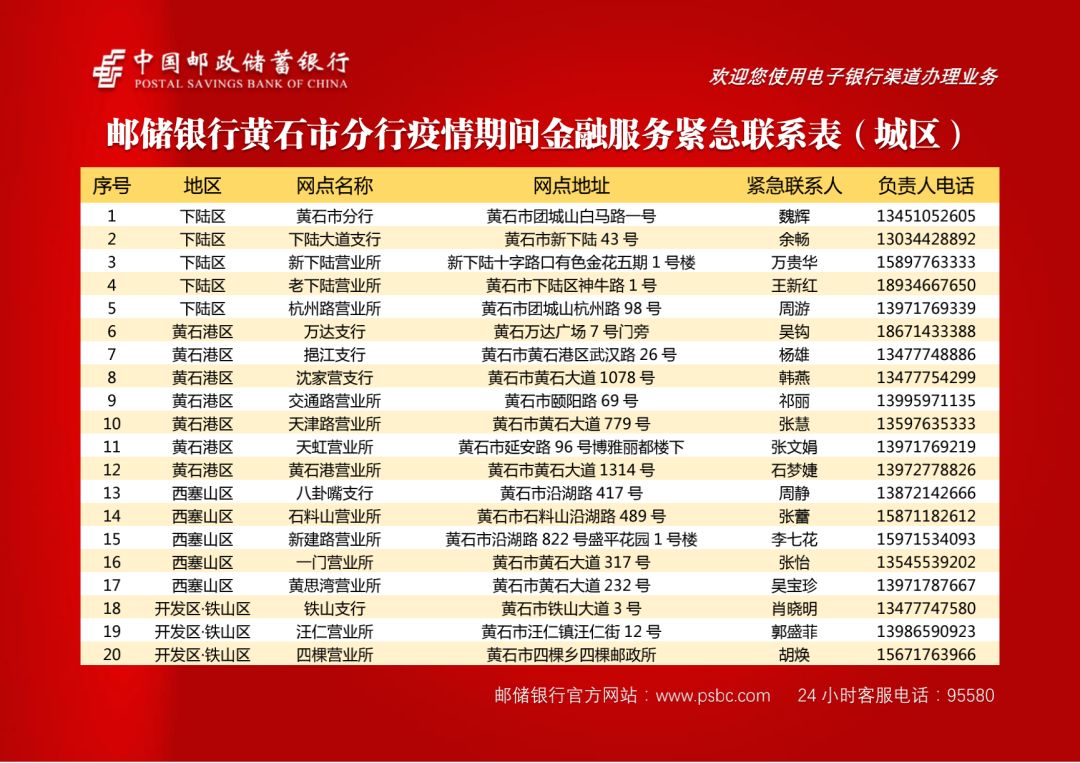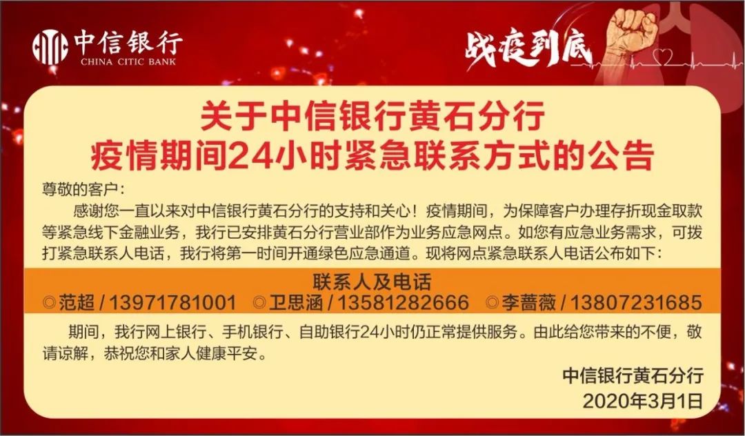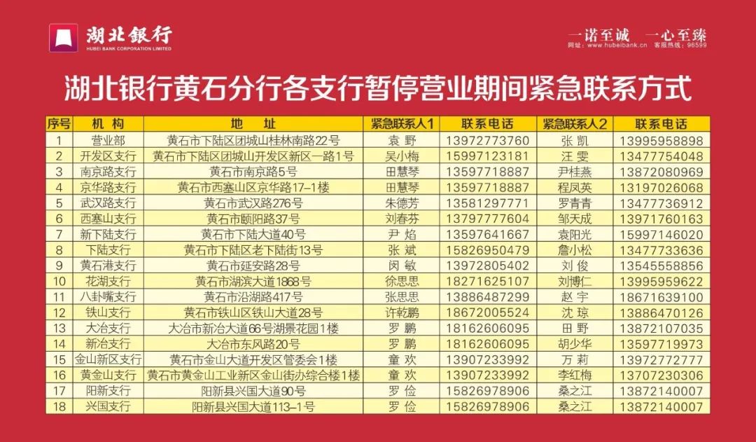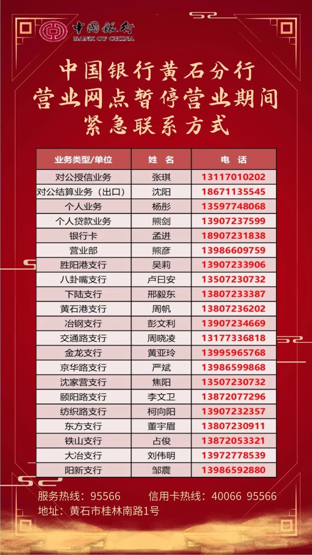 疫情防控期间,在全面落实黄石市“不见面、少见面”疫情防控要求的前提下,尽可能满足广大市民的线下金融服务需求,人民银行黄石市中支组织各银行机构安排应急网点和紧急联系人。目前,各银行机构已经通过网点公告、微信公众号、网络媒体等多种形式告知客户具体情况。广大市民如有紧急的取现业务需求,可直接拨打银行机构对外公布的联系电话,届时银行机构将安排工作人员办理。湖北银行黄石分行