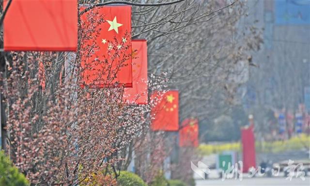 没有一个春天不会到来。3月10日。宜昌江南大道春意盎然,道路两旁盛开的红叶李花簇拥着鲜红的国旗。(湖北日报全媒记者 刘曙松 摄)