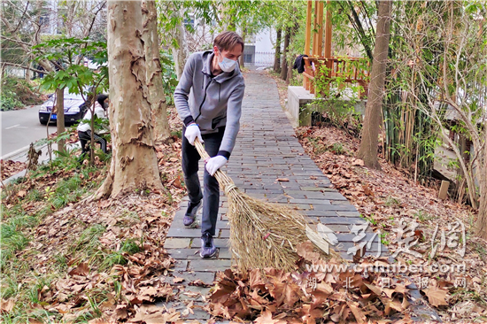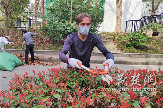 来自比利时的武汉生物工程学院外籍教师Jerry Van Oudenhove,自疫情发生以来,婉拒归国建议,坚持留汉共战“疫”,赢得了无数掌声。当前,武汉战“疫”进入决战决胜阶段。连日来,为筑牢环境卫生治理防疫线,保障在校教职工的健康,该校组织在校党员干部和志愿者,将科学疫情防控与人居环境治理有机结合起来,开展系列公益劳动、清扫教职工小区内的道路和花坛落叶、修剪院内树枝、对果园果树松土除草、消除卫生死角,为在校教职工营造良好生活环境。