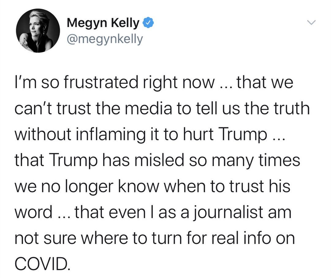 不过,特朗普在疫情期间也曾多次指责《纽约时报》等媒体报道“假新闻”。总统和媒体的互相攻讦,加剧了信息的混乱。前福克斯新闻台主播梅根·凯莉在推特上发表评论说:“我现在十分崩溃……媒体除了谴责特朗普,什么真实的消息都不能提供……而特朗普误导了民众这么多次,我们也不知道什么时候应该相信他的话……甚至作为一名记者,我都不知道去哪里能找到关于疫情的真实信息。”