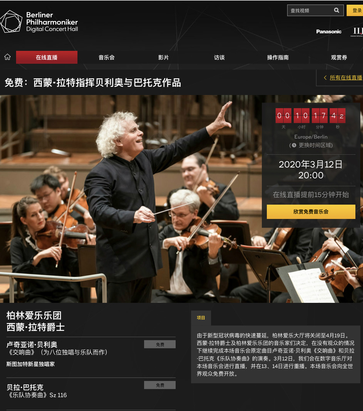 与此同时,当晚(12日)20点,英国指挥家西蒙·拉特尔执棒的音乐会将在无现场观众的情况下继续完成原定曲目卢奇亚诺·贝利奥《交响曲》和贝拉·巴托克《乐队协奏曲》的演奏,并且对全世界观众进行免费直播。