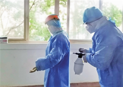 黄石“小汤山”医院医护人员互相消毒 东楚晚报记者 何戈 摄