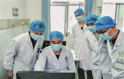 江苏支援黄石医疗队的俞冲(左二)与大冶医生讨论病案 通讯员 叶剑锋 摄