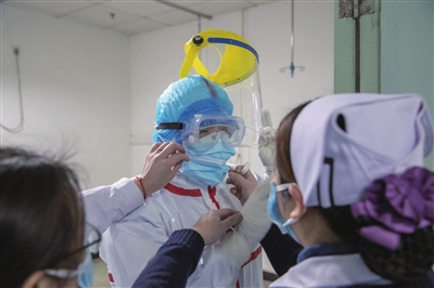 黄石市五医院的护士魏丽在同事的帮助下穿防护服 东楚晚报记者 何戈 摄