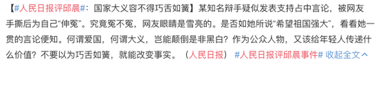 网易娱乐3月17日报道 近日,有网友扒出《奇葩说》选手邱晨几年前在国外社交平台上的言论,指她曾参与香港占中的活动海报设计,还多次发表不当言论。对此,人民日报发表评论,称究竟冤不冤,网友眼睛是雪亮的。是否如她所说“希望祖国强大”,看看她一贯的言论便知。何谓爱国,何谓大义,岂能颠倒是非黑白?作为公众人物,又该给年轻人传递什么价值?不要以为巧舌如簧,就能改变事实。