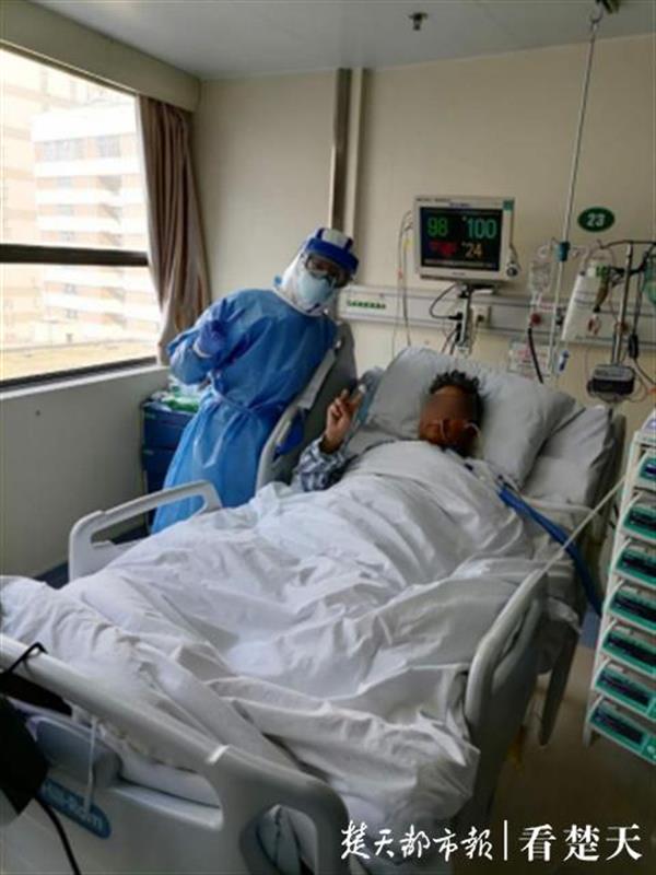 在武汉协和医院ICU,一名新冠肺炎重症患者,从病危到如今脱离呼吸机,还能下床走动。他的康复,鼓舞着医务人员。