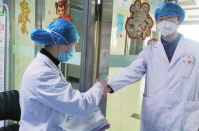 护士给进入病房的医生量体温
