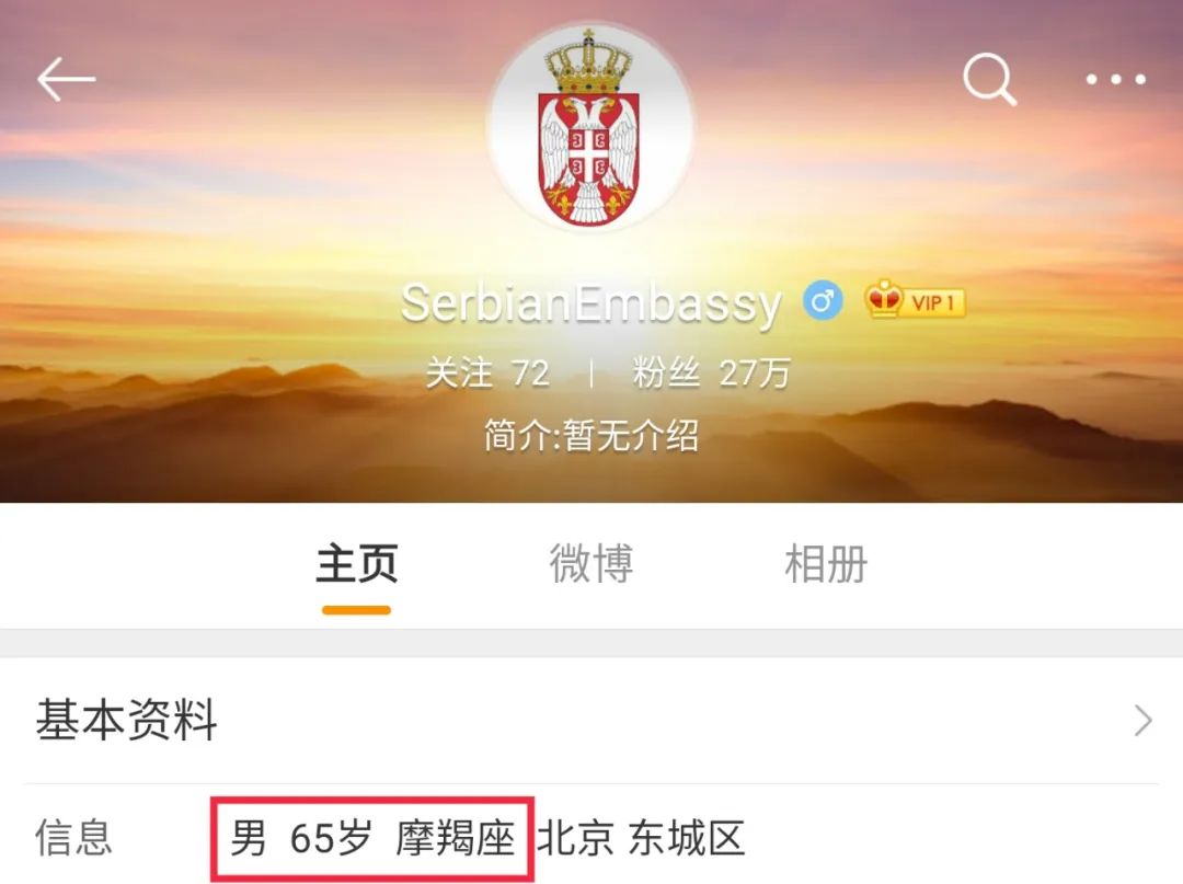 @SerbianEmbassy 官微备注的“年龄”是65岁,很快就有网友看出了其中的心思: