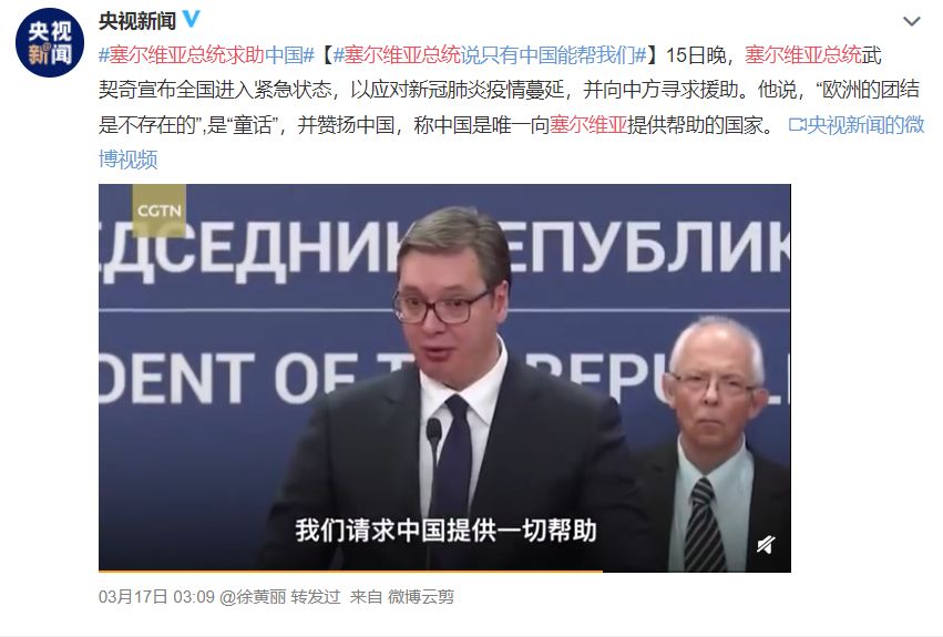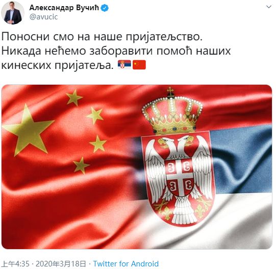 当地时间3月17日晚,武契奇通过推特向中国表示感谢,还配了张两国国旗融在一起的图片:“我们永远不会忘记中国朋友的帮助!”