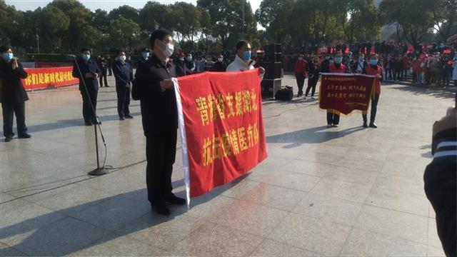 赵利洪与刘建华分别代表新洲区和青海医疗队,互送锦旗。武汉市政府党组成员李强代表武汉市政府,向青海医疗队全体成员致以衷心的感谢。