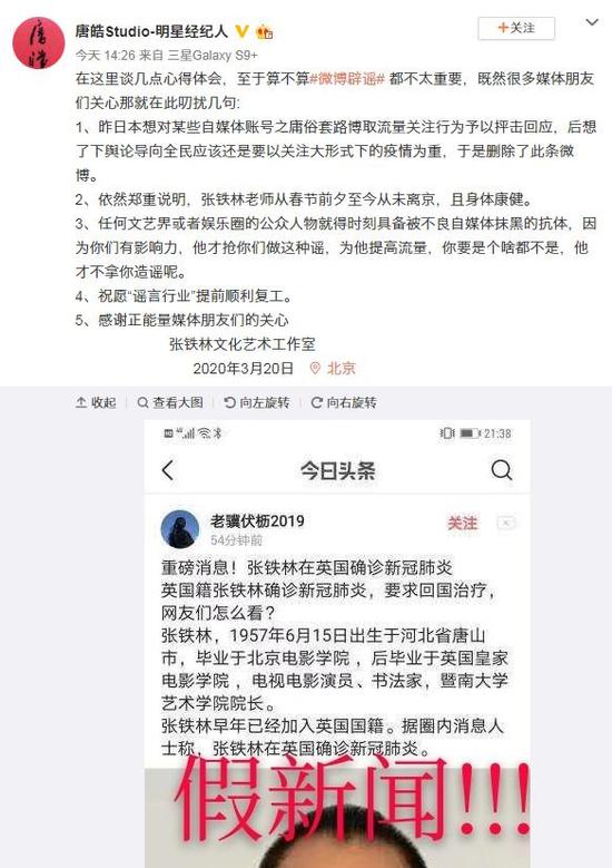 20日下午,张铁林经纪人再发文表示删文是因为不想帮自媒体炒作博取流量,并郑重说明:张铁林老师从春节前夕至今从未离京,且身体康健。