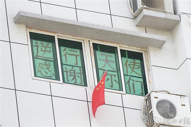 2020年3月20日上午,武汉市武昌区水果湖街红军村小区居民在自家窗台贴上“逆行天使,感谢你们”,以表达对广西医疗队的敬意。