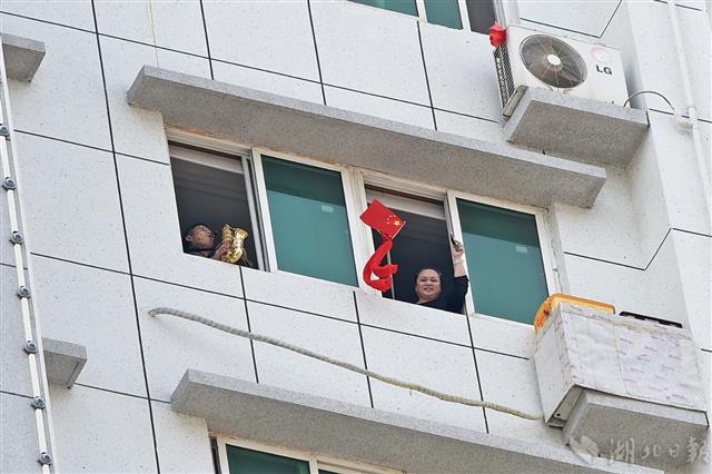 2020年3月20日上午,武汉市武昌区水果湖街红军村小区居民在自家窗台边吹奏萨克斯《友谊地久天长》欢送广西医疗队返程,挥舞国旗高喊“感谢你们”。