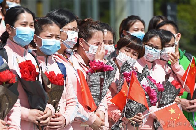 2020年3月20日上午,武汉富力万达嘉华酒店门口,广西医疗队100名队员在鲜花和掌声中启程回家。欢送仪式上,一名女队员不禁落泪。