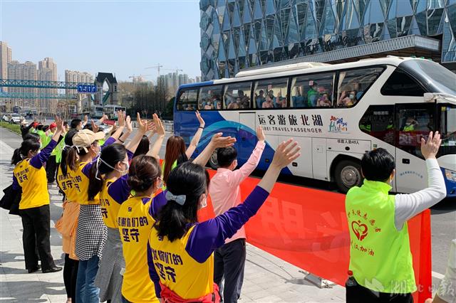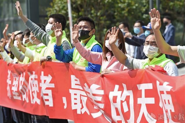 2020年3月20日上午,武汉富力万达嘉华酒店门口,广西医疗队100名队员在鲜花和掌声中启程回家。欢送仪式上,志愿者向广西医疗队挥手告别。(湖北日报全媒记者 李溪 摄)