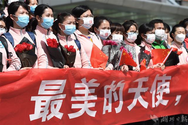 2020年3月20日上午,武汉富力万达嘉华酒店门口,广西医疗队100名队员在鲜花和掌声中启程回家。