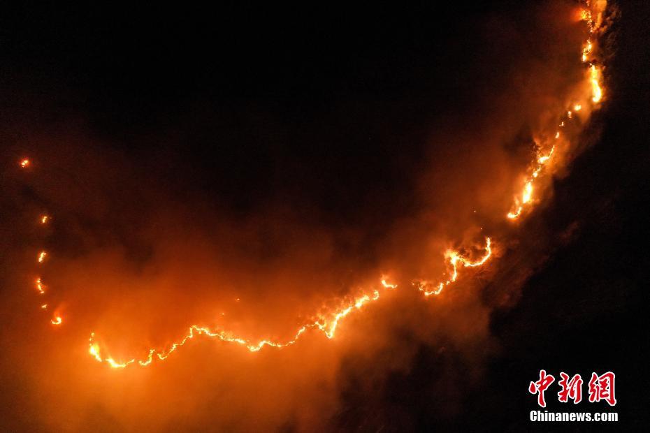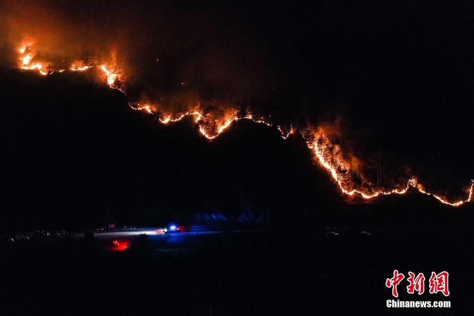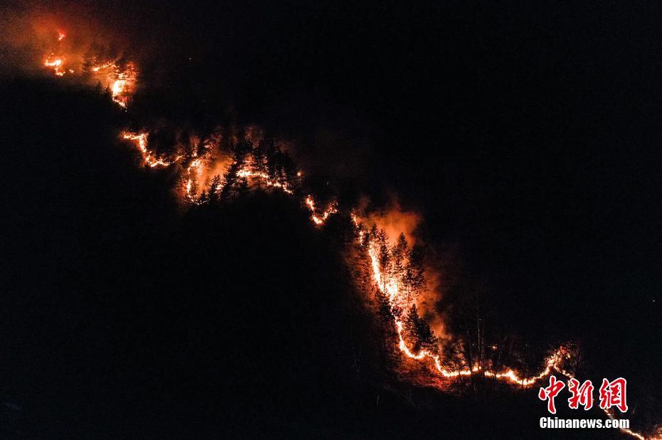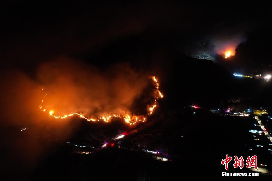 3月20日晚,航拍山西忻州五台山森林火情。3月19日18时10分,五台山景区台怀镇佛母洞锦绣索道停车场附近发生火情,着火点距五台山核心区9.5公里。中新社记者 武俊杰 摄