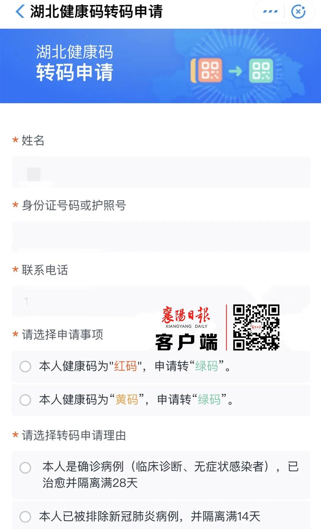如果您对自己的黄码或者红码有异议,可以直接点击健康码页面上的“湖北健康码转码申请”来申请修改健康码状态。湖北健康码转码申请步骤:
