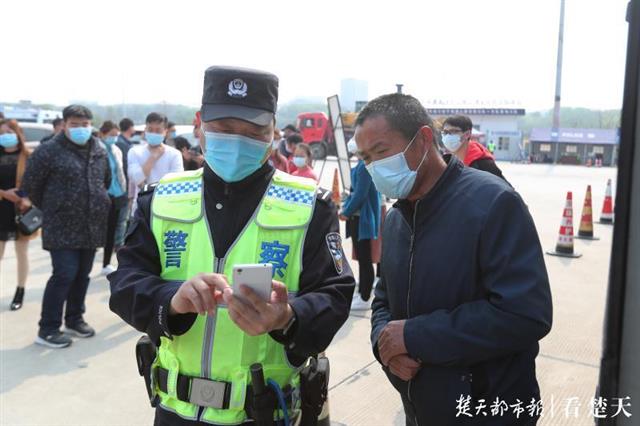 十里铺检查站公安检查站民警胡玮对“点对点”包车返汉人员进行核查