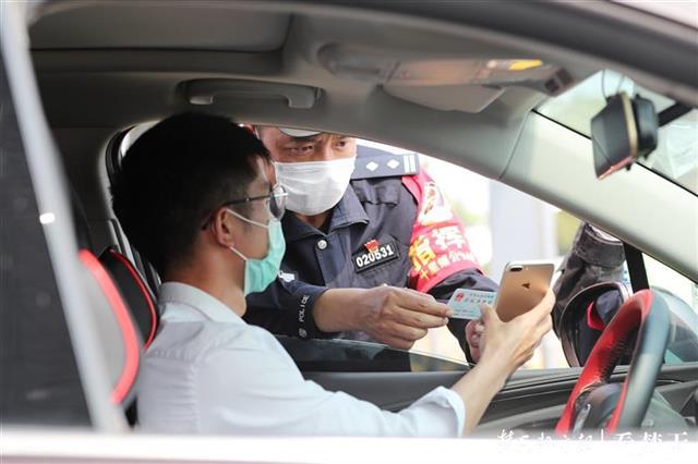 十里铺公安检查站民警张波对返汉人员进行绿码和身份证核查