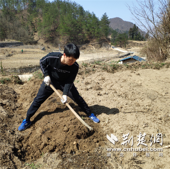 荆楚网客户端—荆楚网消息(通讯员 周晚霞 黄杉杉)这段时间,家住黄冈市英山县夏河村的武汉生物工程学院退伍大学生徐松盛十分忙碌,网课间隙,他就扛起锄头到田间地头和父亲一起春耕春播。“这个假期我特别开心也特别珍惜,我能在家一边学习一边干农活为父母分忧,充实而自豪。”徐松盛说。