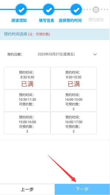预约时间选择先选择预约日期,在选择预约时间,点击下一步,完成预约。