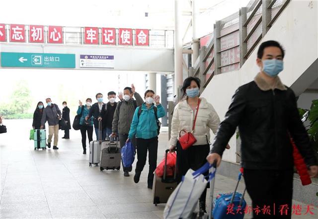 今日上午,麻城市431名复工人员经过麻城北站铁警和防疫人员严格查验,乘坐G4061次复工专列,“点对点”一站式前往广州南站。