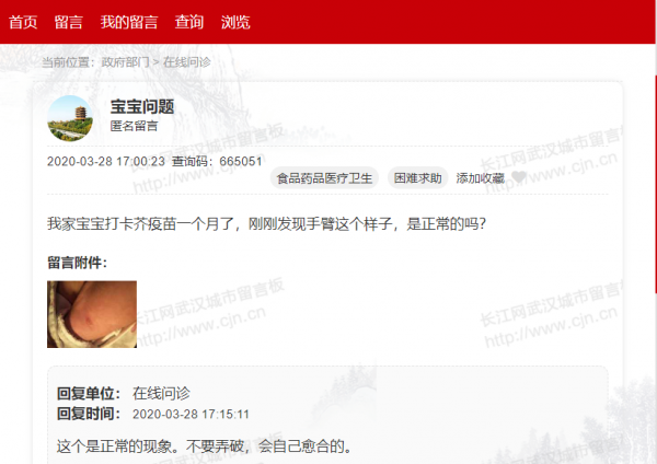 在长江网的在线问诊版块,不少市民对宝宝打疫苗后的反应提出咨询