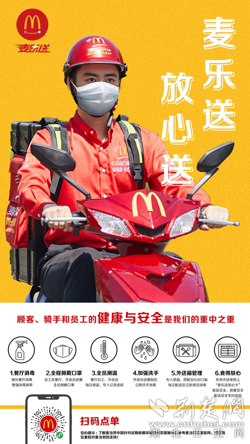 在恢复营业前,湖北所有麦当劳餐厅都已聘请第三方专业消毒公司进行全面的消杀。相关餐厅也进一步升级了相关防疫措施。针对外送服务,麦当劳更启动六大举措,全面保障“麦乐送安心送”:
