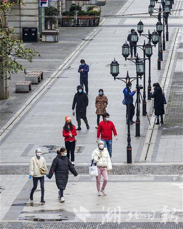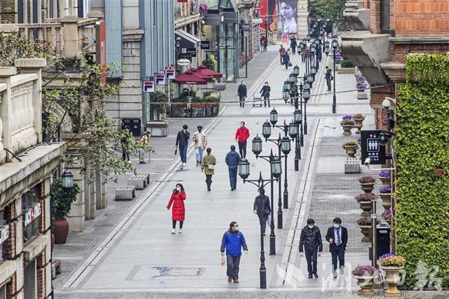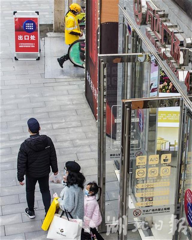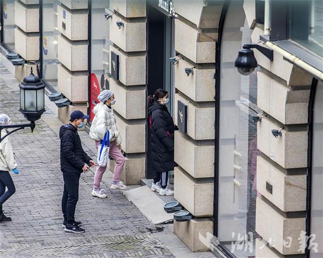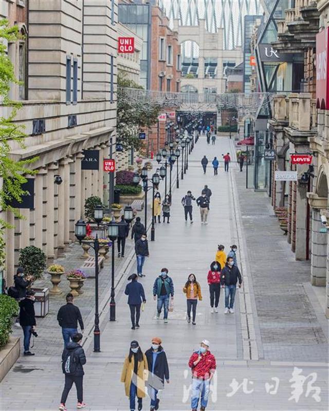 3月30日,武汉汉街重启开街。市民出示健康码、测量体温合格后可进入汉街及万达广场等商业门店购物。(湖北日报全媒记者 梅涛 摄)