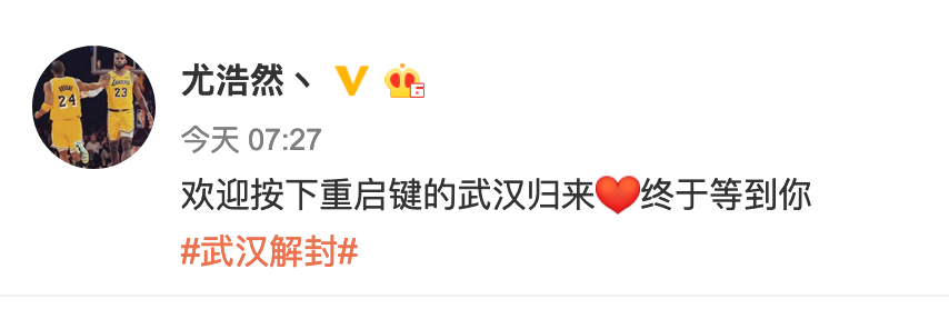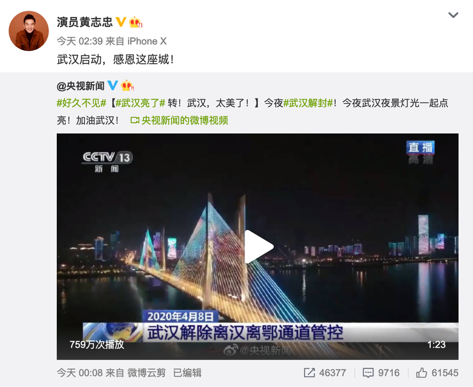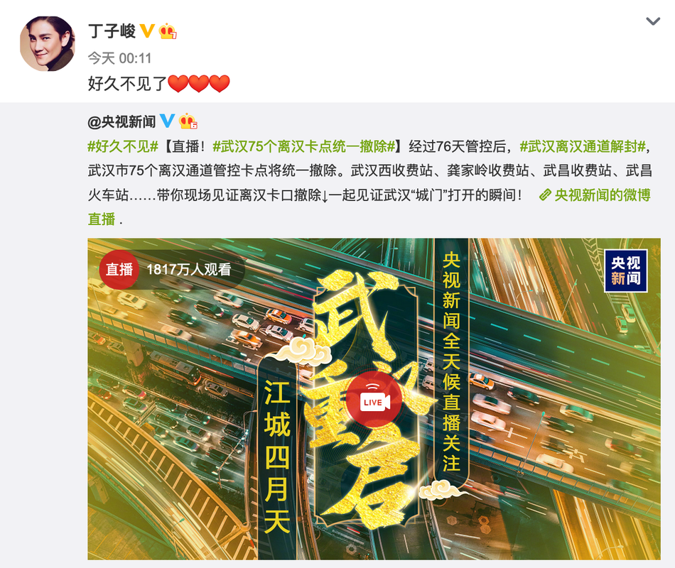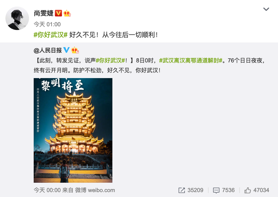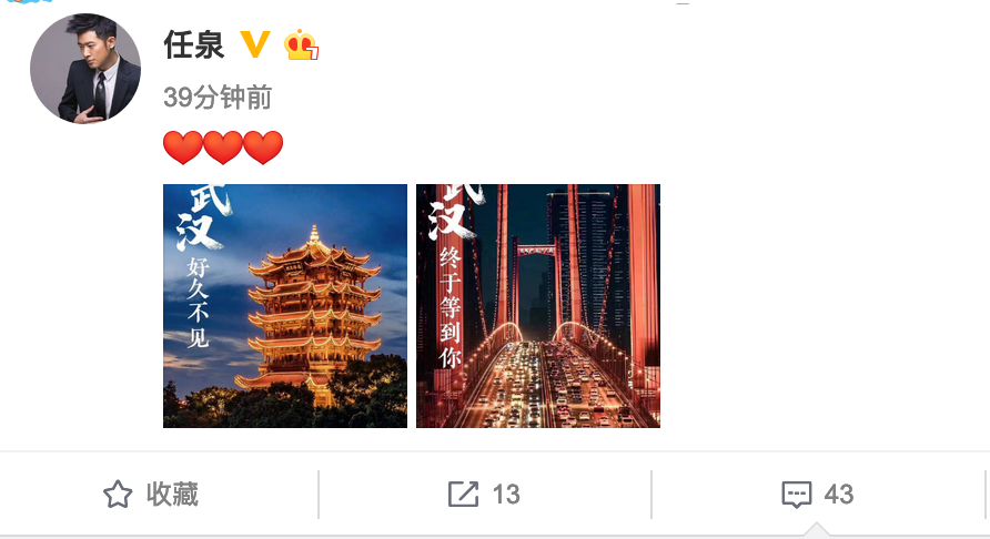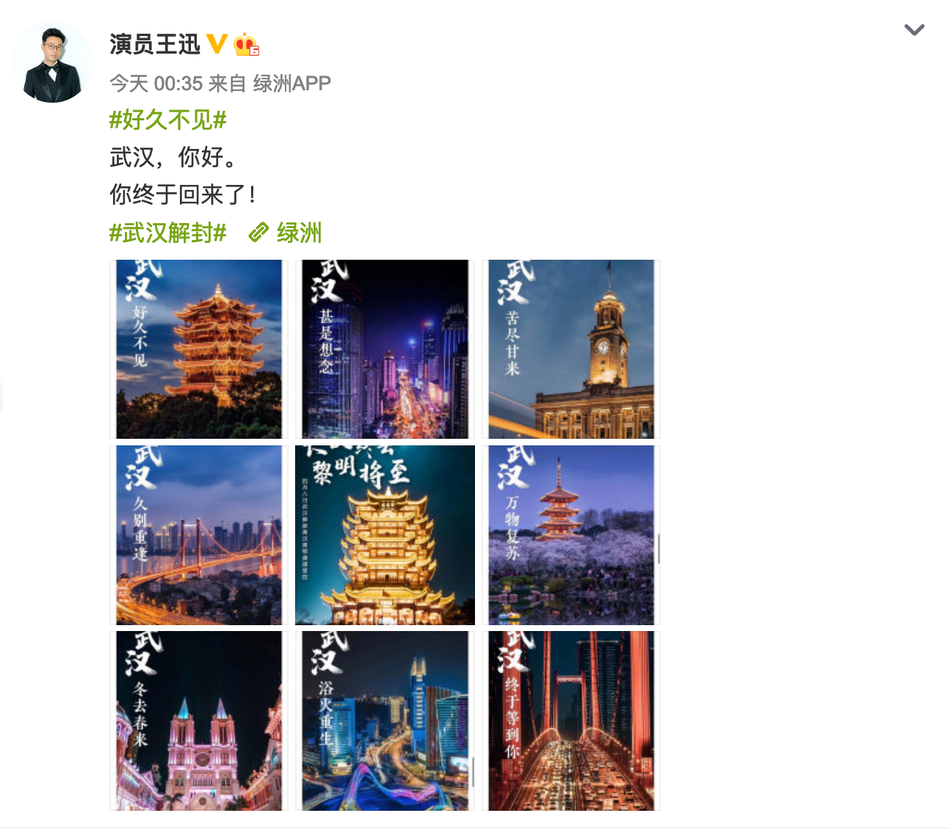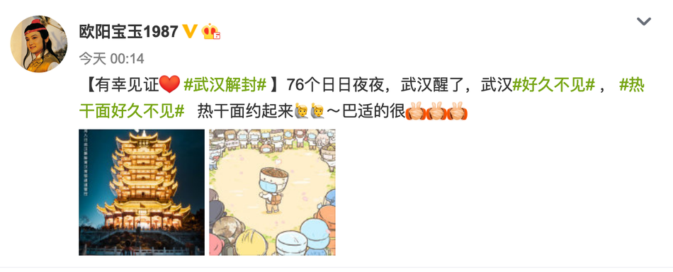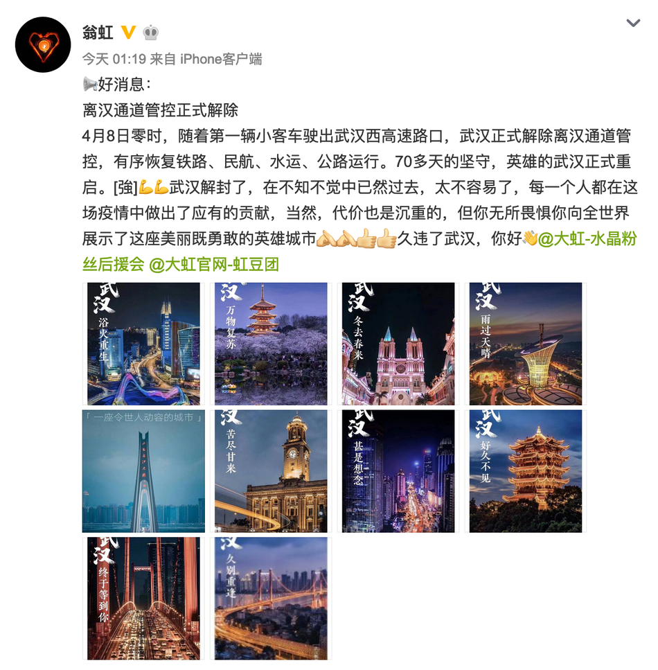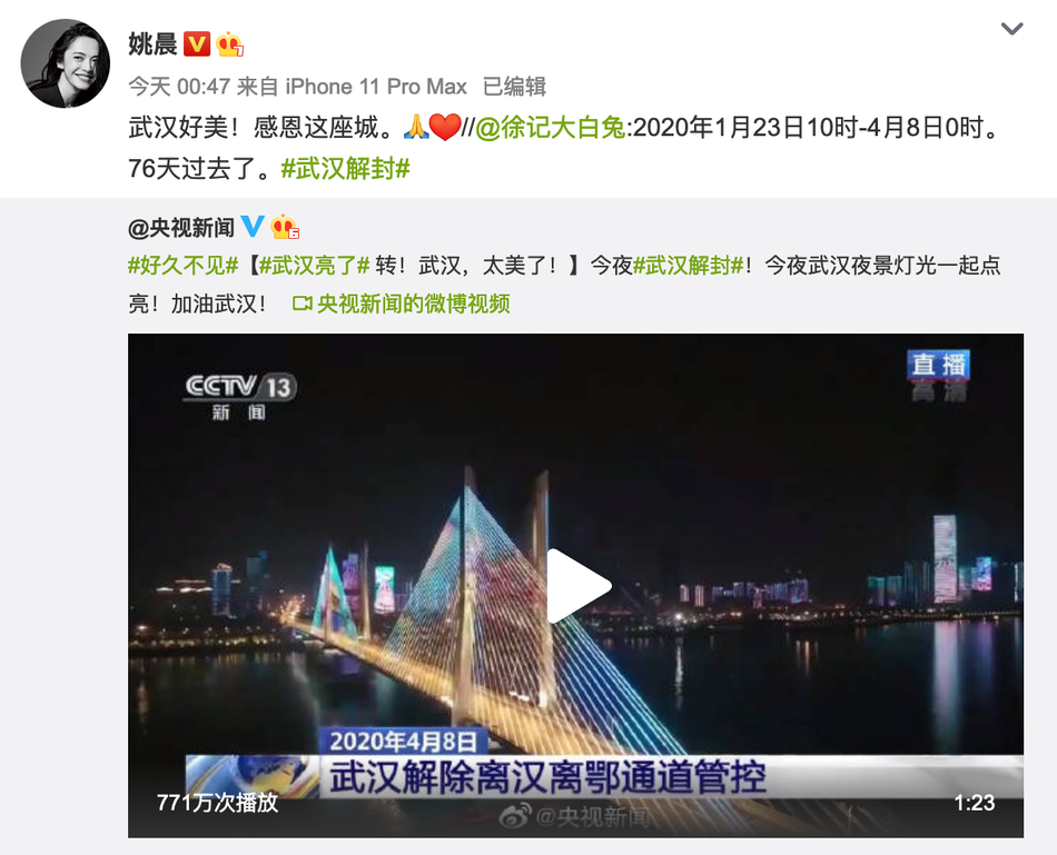 好久不见!何炅姚晨等众星发文庆祝武汉解封
