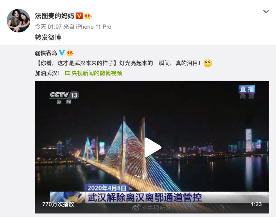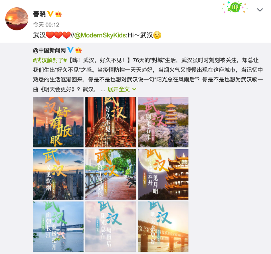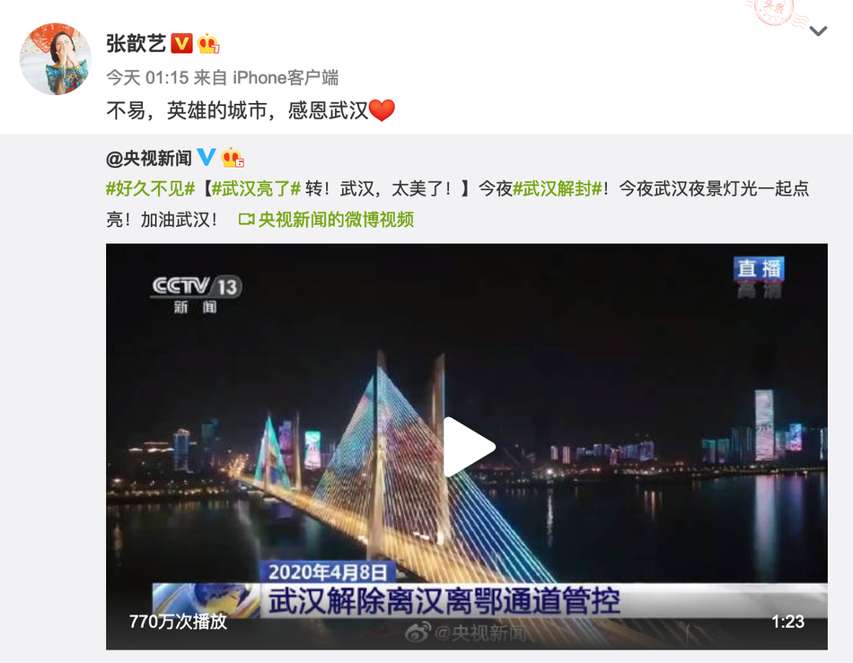 4月8日0点,经过76天管控后,武汉解除离汉通道管控,正式解封。何炅、姚晨、张歆艺等众星纷纷发文,庆祝武汉解封。