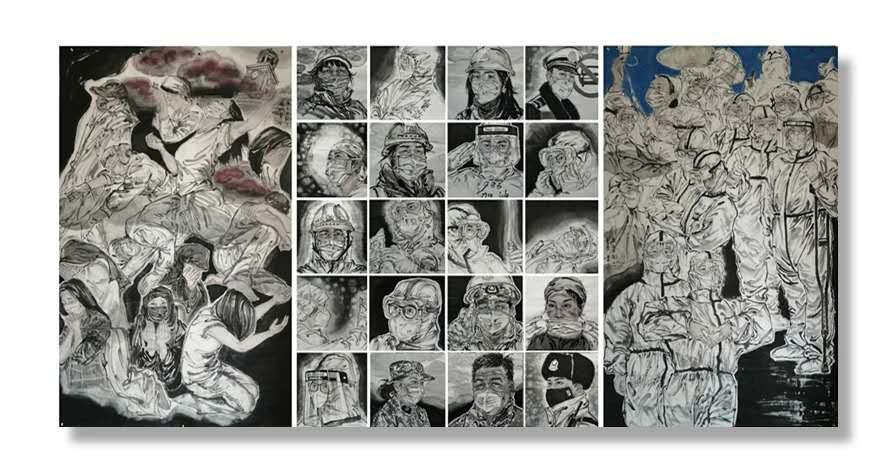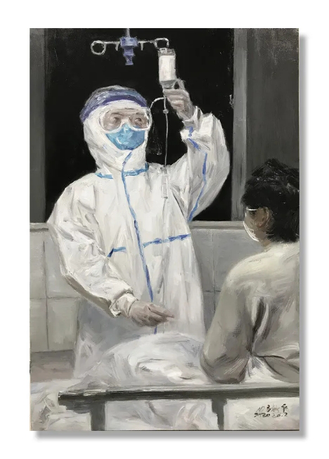 疫情期间,学院空间艺术研究院及时发出了“用画笔讴歌生命”号召,开展“武汉表情”美术作品征集活动,徐勇民、董继宁等一批湖北著名艺术家,与全省学院派的艺术家们一起,以画笔为武器,创作了大量抗疫书画作品,湖北省学院空间艺术研究院精心挑选了100余幅作品进行集中展示。这些作品,再现了疫情防控阻击战的英雄画面,既有逆行出征白衣医护战士,又有敢打头阵的人民子弟兵,既有坚守基层的社区工作者,又有服务一线的各类志愿者形象,主题鲜明,形式丰富,作品质量高。