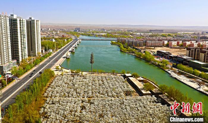 库尔勒市杜鹃河边梨花盛开,呈现出“半城梨花半城水”的生态景观。 魏银和 摄