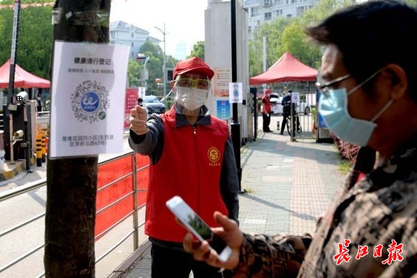 黄陂区盘龙城兴龙社区,区文旅局12名下沉党员干部每天坚守岗位,和物业、社区工作人员一起共抓“四必”管理,对进出小区人员“身份必问”“体温必测”“信息必录”“口罩必戴”,居民出行、上班凭健康码或社区出具的健康证明和单位出具的复工复产证明出行。 (记者杨涛 摄影报道)
