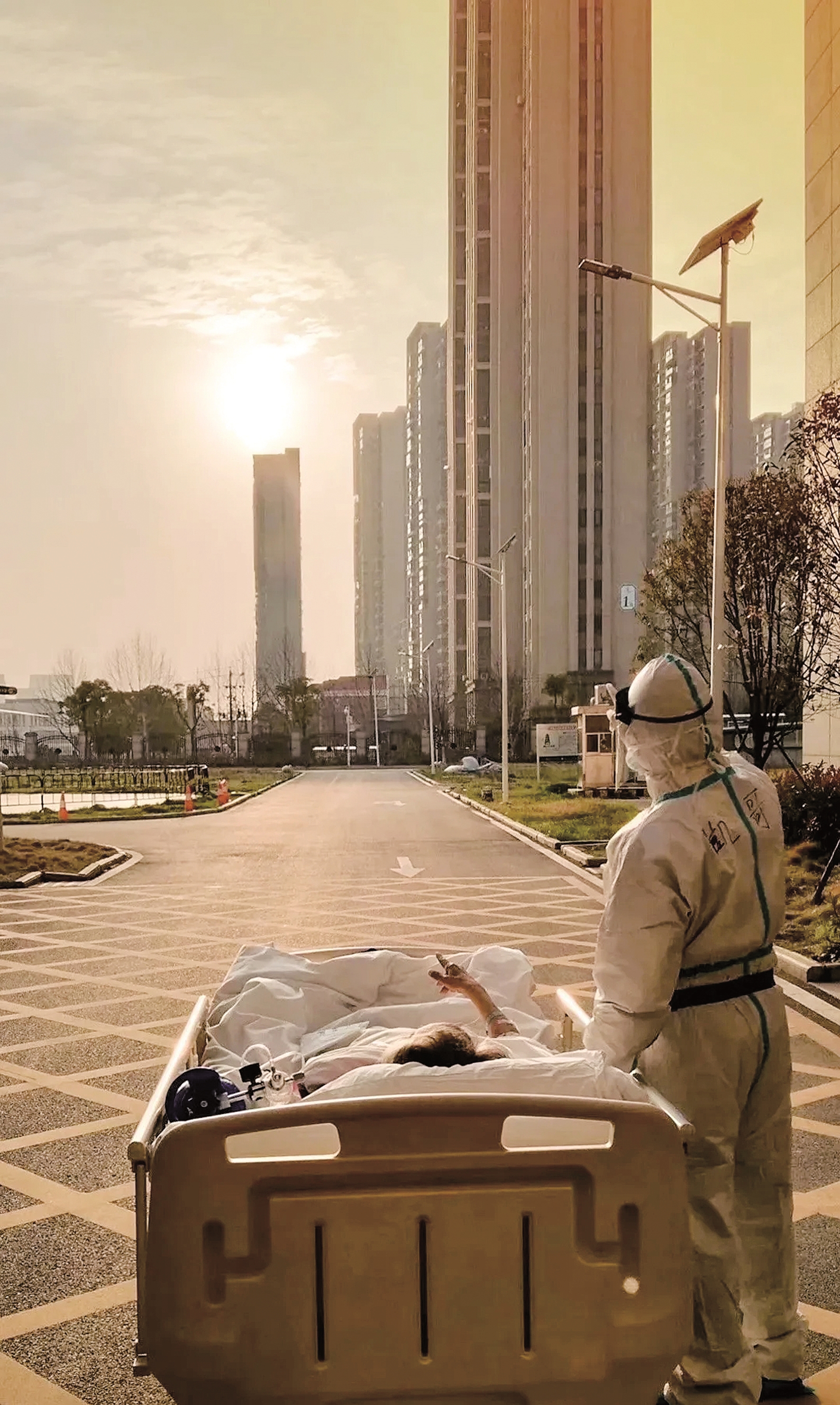 在医护人员的精心照顾下,老人一天天好转起来。3月5日傍晚,27岁的刘凯医生送他去做CT,途中停下脚步,让病床上的老人看了几分钟的夕阳。抗疫志愿者、武大人民医院东院区陪检员甘俊超用手机拍下这一幕,上传网络,温暖了无数网友。