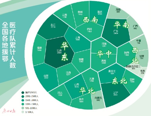 广东21个地级及以上市均有参与此次援鄂行动,2484名队员分别派往武汉1899人,荆州580人,宜昌5人。珠三角地区派出2064人,粤北地区派出203人,粤西地区派出123人,粤东地区派出94人。