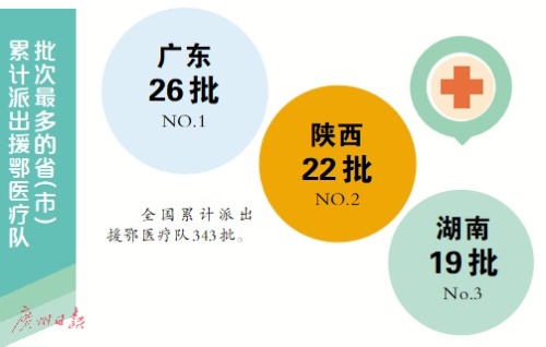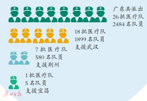 1月24日,广东首批133位援鄂医疗队队员奔赴武汉疫情防控一线。至3月6日,广东共派出26批医疗队,其中18批支援武汉,7批支援荆州,1批支援宜昌。2月9日单日派出的第十批和第十一批医疗队员人数最多,有433人。