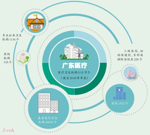 广东卫生资源总量大,医疗服务专业水平高,既是卫生强省,也是医药强省。截至2018年年底,广东医疗卫生机构5.15万个,其中,医院1552个,基层医疗卫生机构48684个,专业公共卫生机构1136个,其他机构155个。全省医院中,三级医院、妇幼保健院、专科疾病防治院共228个,其中,三甲医疗机构128个。
