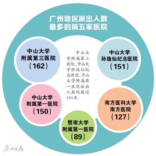在42家广州地区医疗卫生机构中,派出人数最多的前五家医院均为高校附属医院,分别是:中山大学附属第三医院、中山大学孙逸仙纪念医院、中山大学附属第一医院、南方医科大学南方医院和暨南大学附属第一医院。