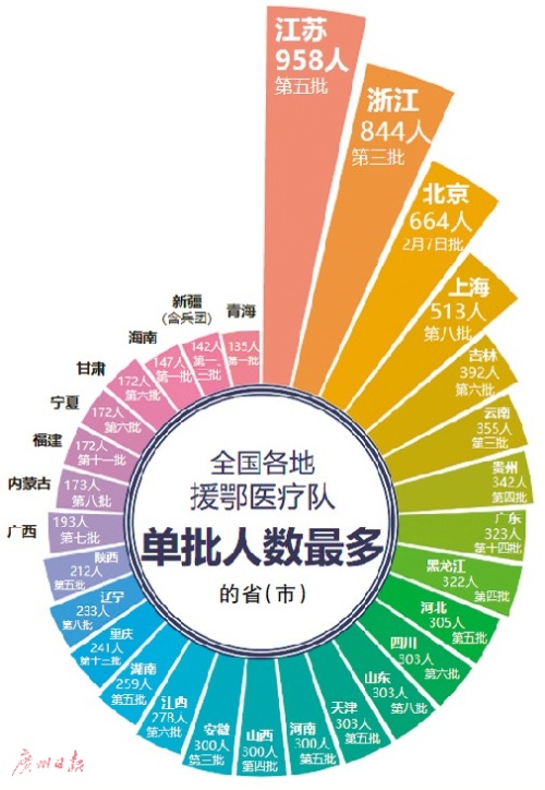 从援鄂医疗队单批派出人数看,人数最多的三个批次如下:江苏第五批有958人,浙江第三批有844人,北京2月7日派出664人。广东第十四批派出人数最多,为323人。