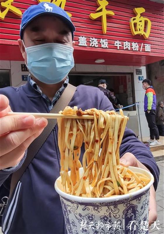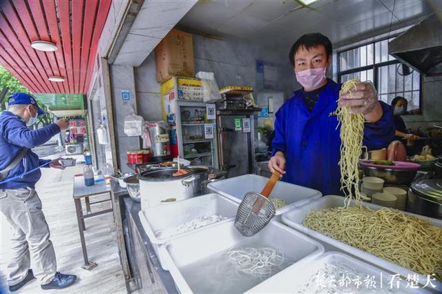 在黄鹂路一家售卖热干面的门面内,老板面戴口罩,手戴一次性手套,给顾客烫热干面。为了减少接触,老板在门外一步远的距离拉了一根蓝色的绳子,让顾客都站在绳子外面等餐,以拉开距离。另外,香醋、打包袋和纸巾都放在了门面外的一个小桌子上,由顾客自取。