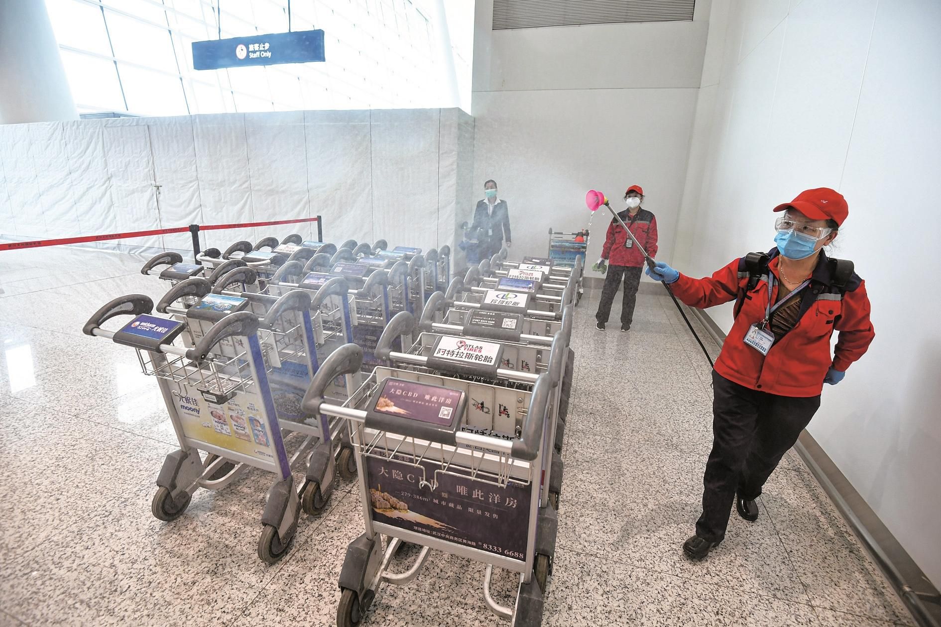 航站楼内,旅客用完的手推车会被集中转运。昨日10时许,戴着护目镜、口罩和手套的林燕芳一看到手推车转运过来,马上微蹲背起药桶,打开电动开关,沿着手推车把手、车篓、轮子,一路无死角喷雾消杀。