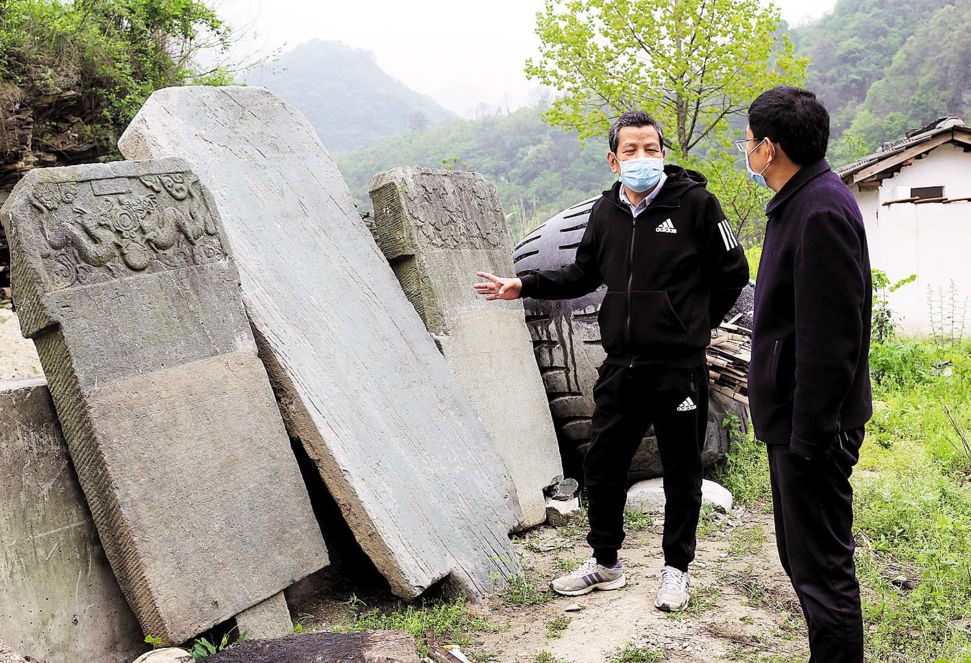 在丹江口市白杨坪林业管理区发现的武当山东至界碑。3块石碑中,两块是功德碑,一块为敕谕碑。 (视界网 胡文波 摄)
