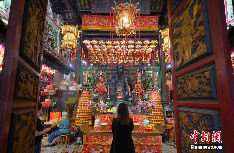 香港特区政府近日宣布,根据《古物及古迹条例》,将湾仔玉虚宫列为法定古迹。湾仔玉虚宫又名湾仔北帝庙,为供奉道教神仙北帝而建,是湾仔早期发展的重要历史地标。主殿供奉前后两尊主神北帝(又名玄天上帝,真武大帝和黑帝),入门玄关供奉一尊重600多公斤的铜制北帝雕像,该雕像原本在1603年的中秋节被供奉在广东道观“碧善宫”,1926年,辗转从广州来到香港,被供奉在九龙城的“五龙院”,日治时期,玄天上帝雕像被移至湾仔北帝庙供奉至今。 中新社记者 张炜 摄