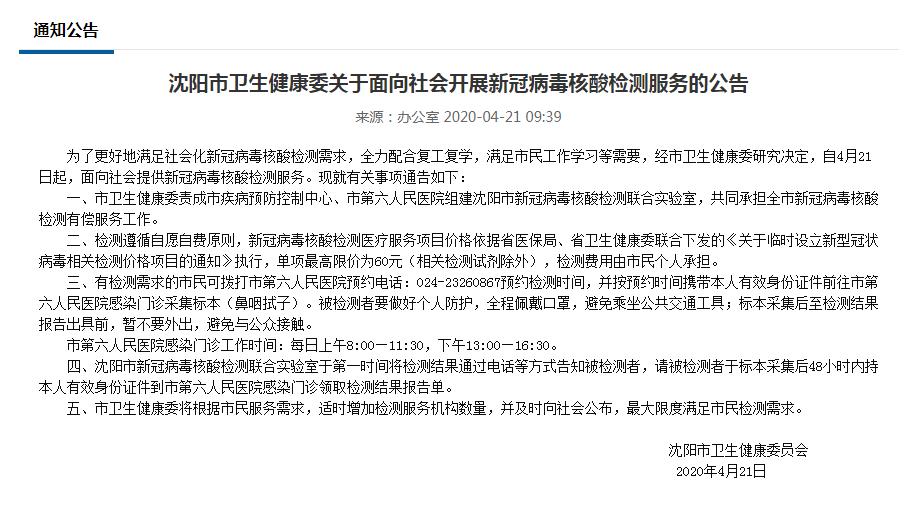 中新网4月21日电 沈阳市卫健委21日发布面向社会开展新冠病毒核酸检测服务的公告。公告称,自4月21日起,沈阳面向社会提供新冠病毒核酸检测服务,检测遵循自愿自费原则,检测单项最高限价为60元(相关检测试剂除外),费用由市民个人承担。