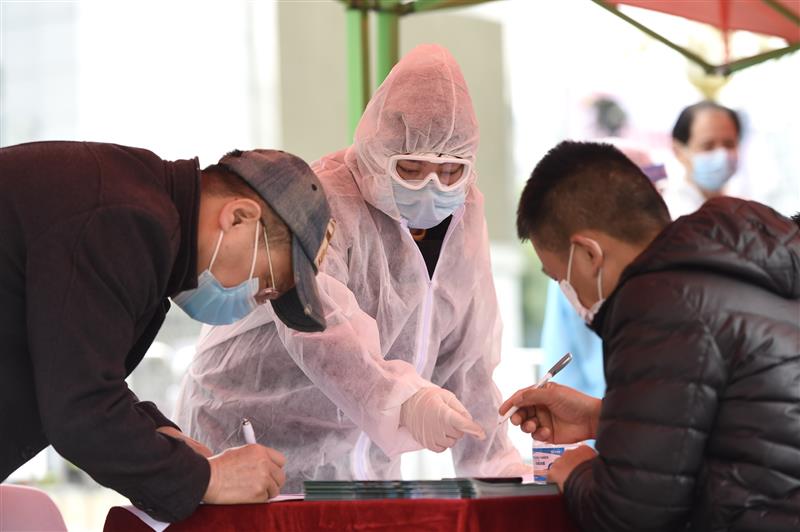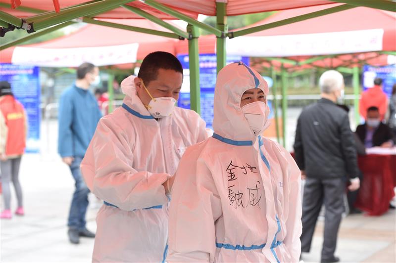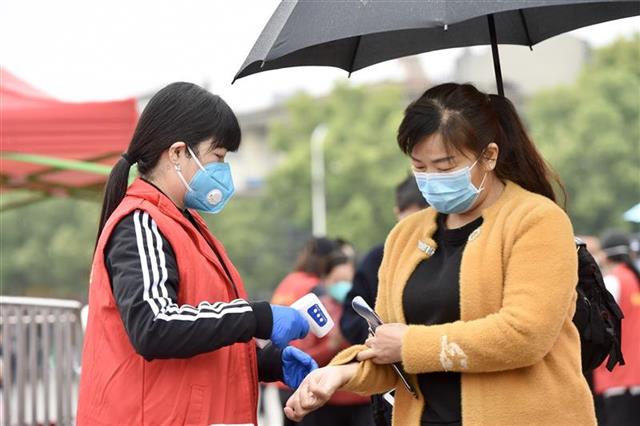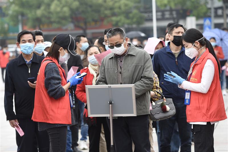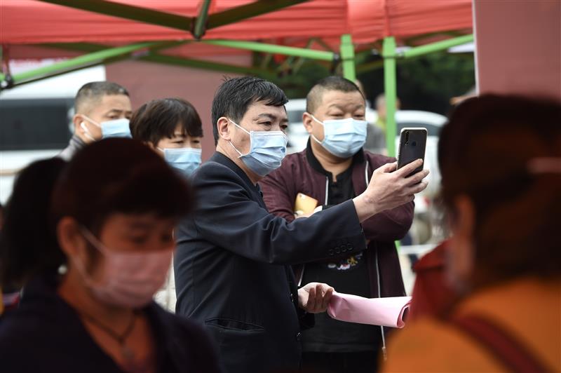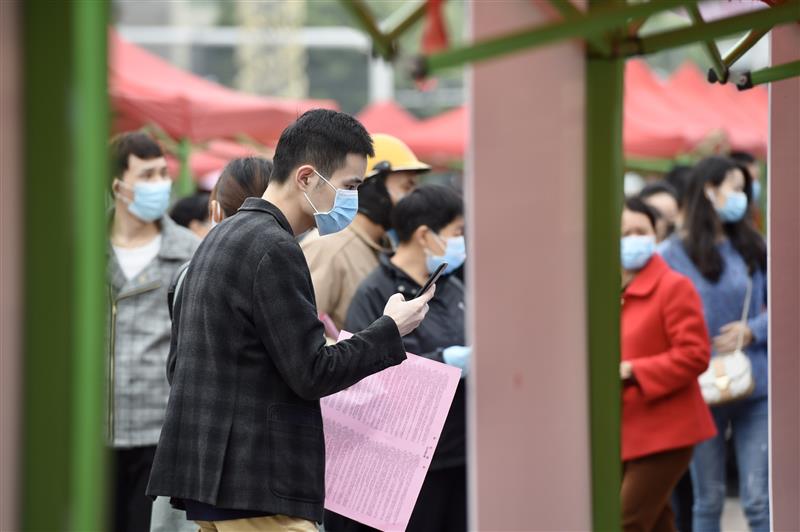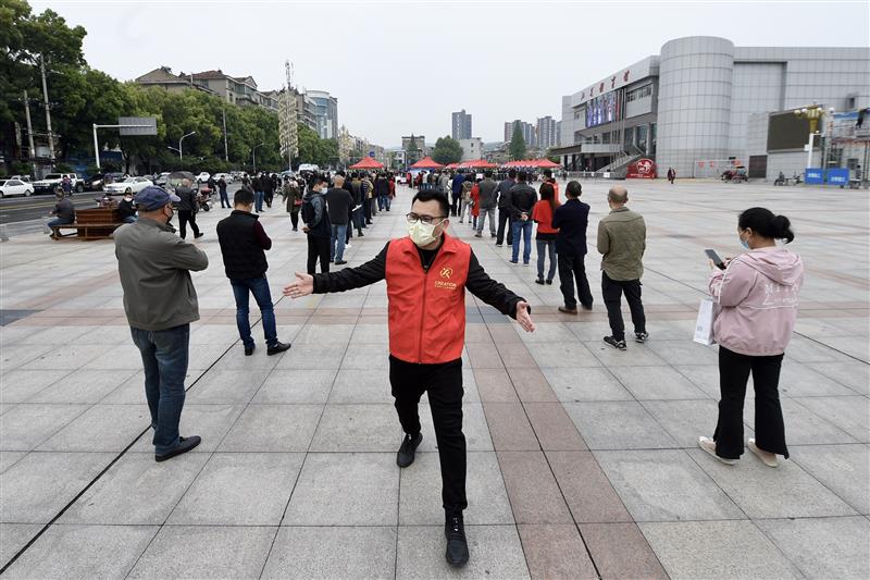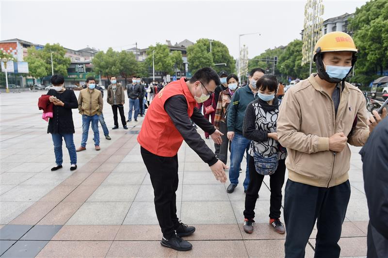 2020年4月21日,武汉市复工复产企业用工现场招聘会江夏分场在江夏体育馆广场举行,涵盖汽车制造、电子通讯、地产经纪、商超零售等行业近40家企业现场提供超过1000个工作岗位,吸引了众多当地居民前来。招聘会现场严格执行防疫管控措施,所有求职者一律间隔1.5米排队并核验健康码、测量体温进入招聘区。为避免人员集中,招聘区同时在场人数不超过300人。(湖北日报全媒记者李溪摄)